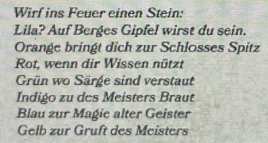 Auf Podesten sind folgende Gegenstände: Ein weiterer Teil des Siegels eine Kette (Fluch verwächst körperlich mit “Effekten” im Kampf) Panzerhandschuhe Ein Schild aus Stahl (resoniert mit Paladin) Eine Stoppuhr (starke Temporalmagie) ein Glöckchen (resoniert mit Musik) ein Dolch Ein Perlenamulett (kleine schwarze Perlen wie Totenköpfe, Illusions- oder Täuschungsmagie) Wurzeln (aus der Fayewild sehr selten und stark magisch verwächst mit Körper)